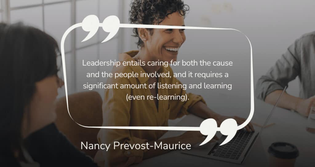 Nancy Prevost-Maurice: Is it too cliché to mention leading by example? In my opinion, a great leader elevates others and prioritizes collaboration in all projects. Leadership entails caring for both the cause and the people involved, and it requires a significant amount of listening and learning (even re-learning). I believe in having many voices at the table when decisions are made.