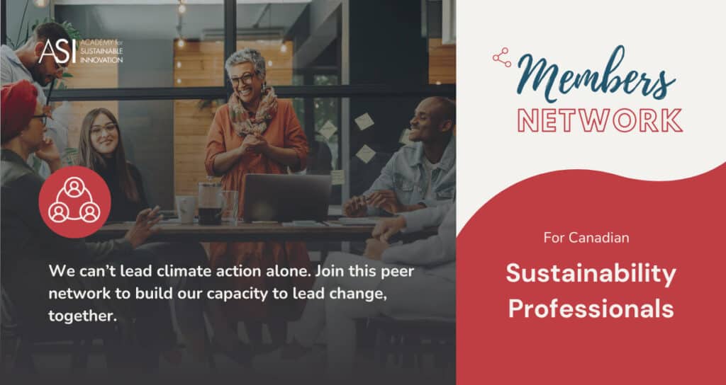 ASI’s Members Network is a peer-to-peer network made up of Canadian sustainability professionals working to accelerate climate action within their organizations. The network offers a space to talk candidly about shifting organizational dynamics and adopting leadership models that support the transition to a sustainable future. Because let’s face it, outdated leadership models have built systems that no longer serve us or the planet.