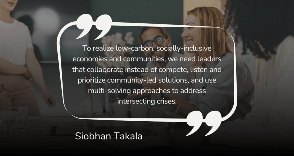 Siobhan Takala: To realize low-carbon, socially-inclusive economies and communities, we need leaders that collaborate instead of compete, listen and prioritize community-led solutions, and use multi-solving approaches to address intersecting crises. We need to learn how to work better together across all the siloes we’ve created, such as industries or geographic boundaries, to push for the futures we need in innovative ways.